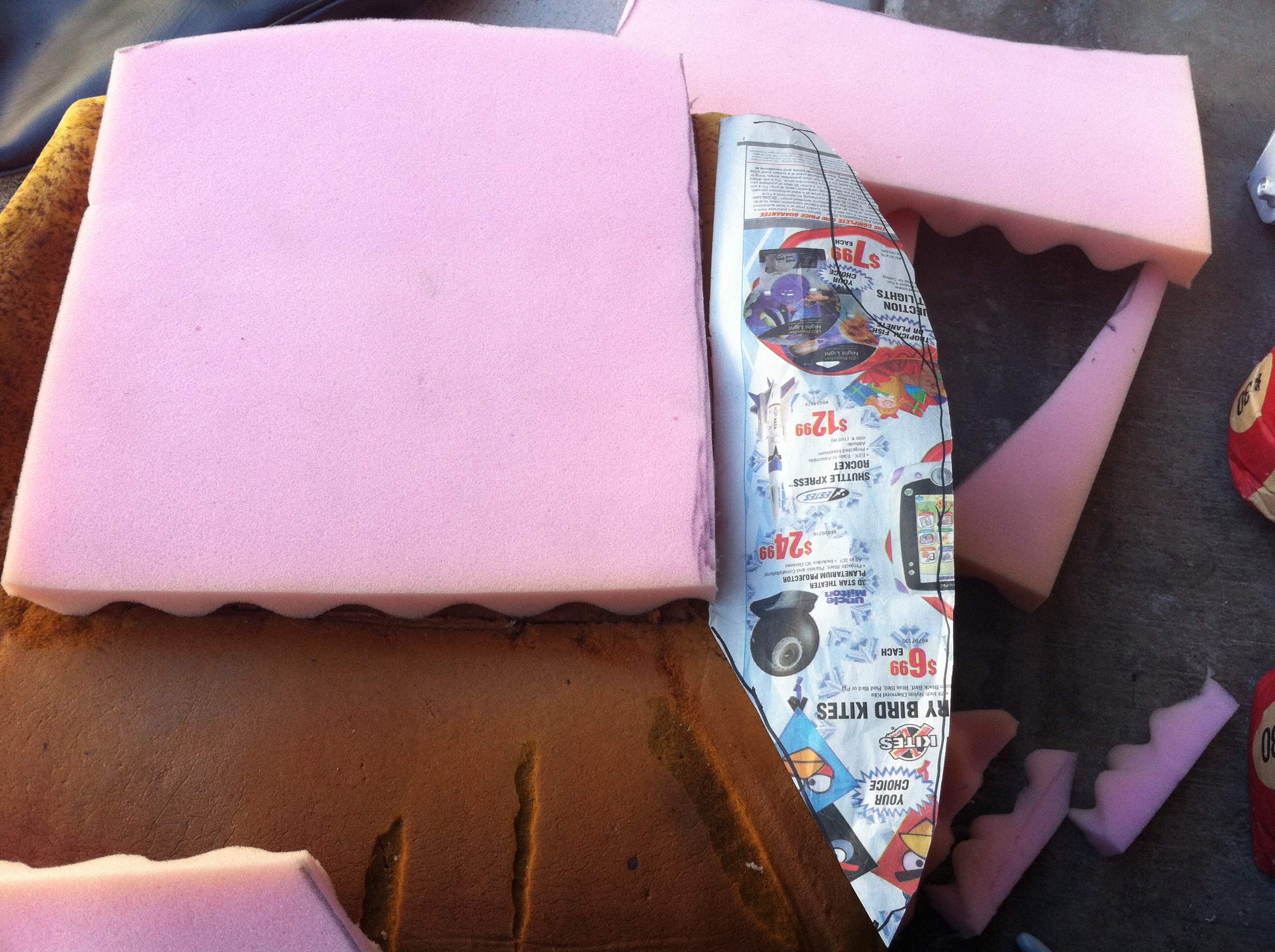 Thursday rolls around for another big day. During the afternoon I had the neighbors install the front and rear windows – truly a blessing to have a family who owns an auto glass repair company live next door to you! Late afternoon, brother brought over another groomsman Jerry and his girl Kennie (who had just both come over from Hong Kong) to lend a hand, helping clean windows and tackle the carpet. Carpet continued to dominate our time because of the measuring / cutting required for all the interior fittings: both sides of the seat belts, shifter, e-brake, and seat rail holes among other things. Carpet needs to go in first because it instantly transforms the visual impact of the car. Additionally, once that’s in, seats, center console, door trim, all that can go back in.