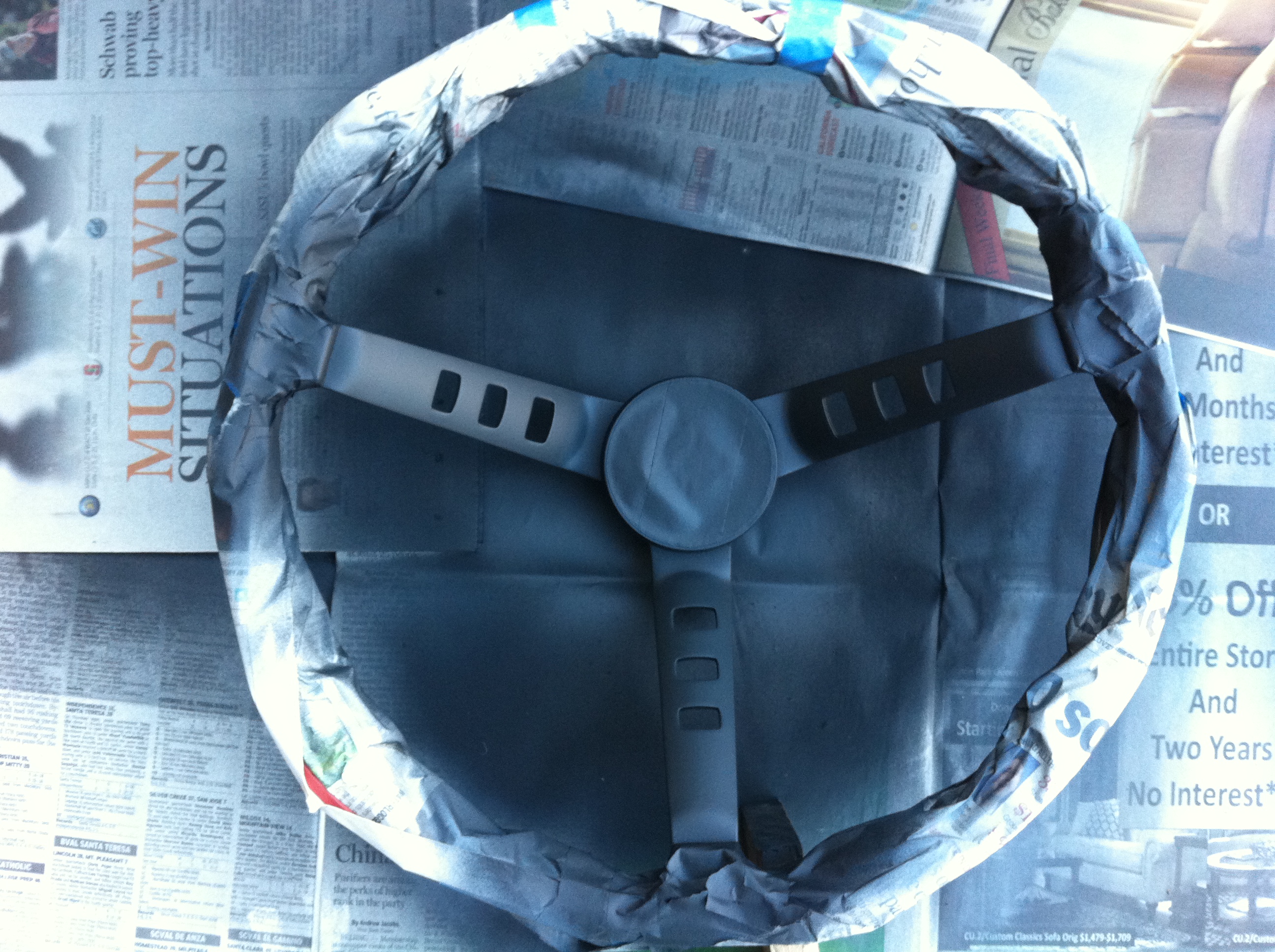 240z steering wheel prep'd masked off 240z steering wheel primer grey coat close up 240z steering wheel primer grey coat