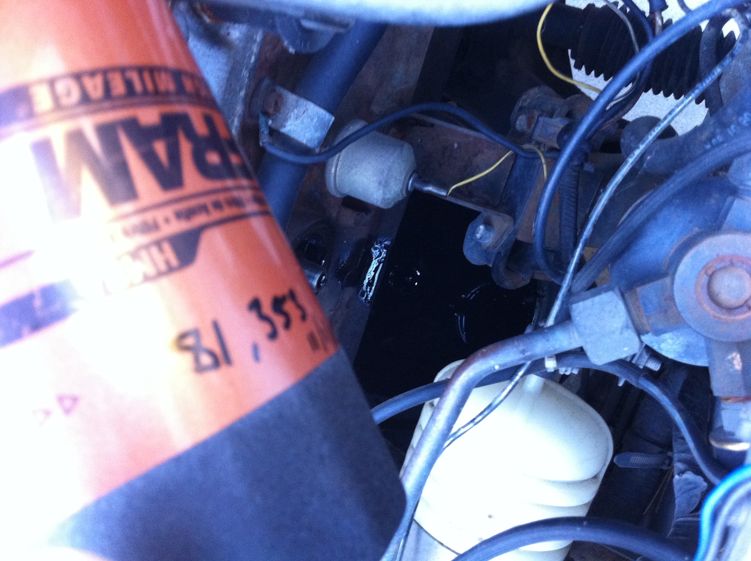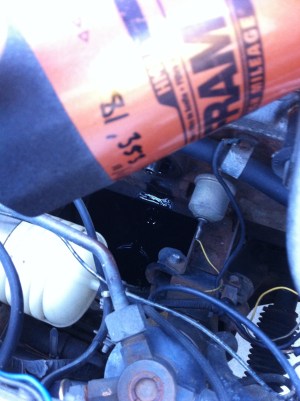 ‘Ink’ Change – Popped the 280 on ramps, popped the hood, popped off the oil pan nut off with my fingers.. wait.. with my fingers? Yep, it was literally being held tight by crusty oil around it’s edges. Same with the oil filter – only loosely screwed on! nice… Even better was the primordial blacker-than-black ooze now seeing the light of day since who knows when.. 1977? It was like ink, colored from the depths of space, kinda black. 4 quarts of 10w30 high mileage later… pprrrr.